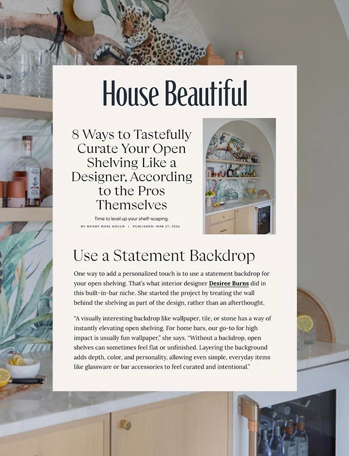 One way to add a personalized touch is to use a statement backdrop for your open shelving. That’s what interior designer Desiree Burns did in this built-in-bar niche. She started the project by treating the wall behind the shelving as part of the design, rather than an afterthought.